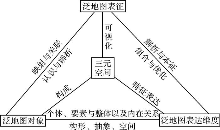 文献[20-22]认为,信息与通信技术的快速发展带动人类进入地理空间、人文社会空间和信息空间相融合的三元空间。地图制图的目的、人员、对象和环境等均发生巨大变化,地图的类型、空间对象、表达维度、地图角色等呈现出显著泛化特征,现有地图学理论无法引领和指导当代的地图实践,地图学理论亟待“突围”。文献[20]提出ICT(information and communication technology,ICT)时代泛地图理论,如图 4所示,辨析三元空间对象的结构关系和抽象模式,构建泛地图对象空间理论;解析泛地图表达维度空间,建立泛地图表达维度谱系;挖掘泛地图表达机制与方法,揭示各类三元空间对象的有效性规律,实现对三元空间的泛地图的优化表达。