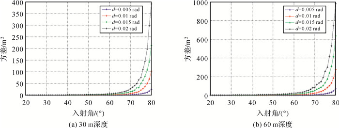 | 图 3 不同深度时入射角扰动对水平位移扰动的方差 Fig. 3 Variance of incidence angle disturbance to horizontal displacement disturbance at different depths |