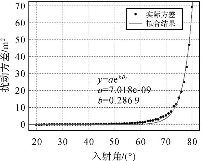 观测方差大致可分为两部分,即入射角相关部分和入射角不相关部分,后者主要来源于声呐仪器测量误差。当入射角大时,则入射角相关误差占主要成分,由图 3可知,此时仪器测量误差可以忽略。从图 3中可以看出,无论30m深度还是60m深度时,当入射角大于50°时,入射角扰动对水平位移的影响开始有上升趋势,在深度60m,入射角80°时,即使入射角加入0.005rad的随机误差,水平位移的扰动方差达到了84.2063m2。可见,当入射角较大时,入射角发生微小变化对水平的影响是指数增长的,即方差随入射角的变化呈指数形式变化。为此,本文使用指数函数模型拟合观测方差