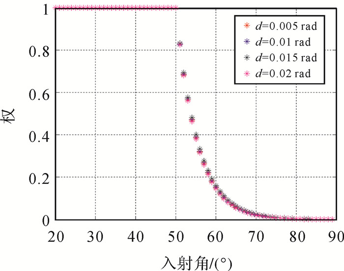 | 图 6 加入不同误差时入射角与权值关系 Fig. 6 Relation ship of incident angle and weight |