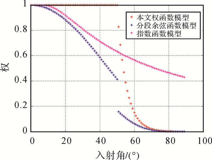 图 7显示在入射角0°~89°时的不同权函数的对比情况, 直观体现出分段指数权函数模型和已有的入射角指数函数模型、分段余弦函数模型。