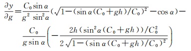 在声线跟踪定位算法中,入射角是需要迭代计算的量,即可表示为声速剖面观测值的函数,因此也是一个随机量。由式(3)可知声线传播的水平位移由入射角α、梯度g和深度h共同决定。为研究上述变量对水平位移的影响,对式(3)中的α、g、h求偏导