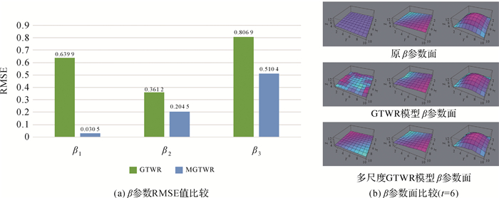 GTWR和多尺度GTWR复制已知参数面的能力由系数βj的均方根误差(RMSE)来估量,较小的RMSE值表示对已知局部参数集的更准确复制。如图 1(a)所示,多尺度GTWR比GTWR更精确地拟合了3个参数,尤其是对β1、β2参数的复制。图 1(b)进一步表明,多尺度GTWR模型参数面的复制情况优于GTWR模型。多尺度GTWR可以较为精确地复制所有3个参数面,而GTWR在复制β1、β2时出现了明显的形变。