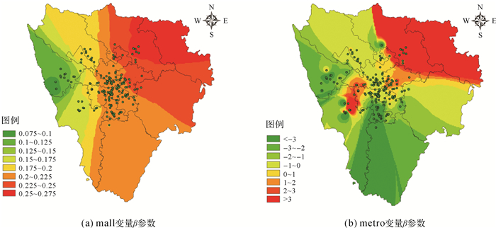 | 图 6 mall和metro估计系数的空间变化(2018年下半年) Fig. 6 Spatial variation of mall and metro estimated coefficients (second half of 2018) |