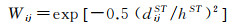 式中,Wij为样本i与j之间的空间权重;dijST为样本i与j之间时空距离;hST为时空带宽。时间带宽hT和空间带宽hS可分别由(hT)2=(hST)2/μ和(hS)2=(hST)2/λ计算,时空距离可由dijST2=λ[(ui-uj)2 +(vi-vj)2]+μ(ti-tj)2计算,此处λ和μ是比例因子,用于确定空间和时间距离对时空距离不同权重的影响。本文中将比例因子设置为λ+μ=1,通过调整比例因子λ,确定空间与时间距离权重的相对大小,从而提高计算效率,且不丧失通用性。