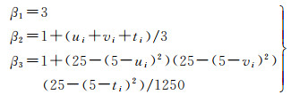 式中,xik是位于位置(ui, vi, ti)的第k个自变量;βk(ui, vi, ti)是位置(ui, vi, ti)处基于单一空间带宽和时间带宽的第k个系数;εi是误差项;yi是因变量。GTWR模型中空间权重的计算采用了时空距离与时空带宽的概念,例如高斯空间权重函数在GTWR模型中形式为
