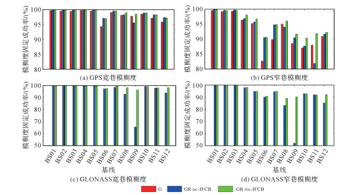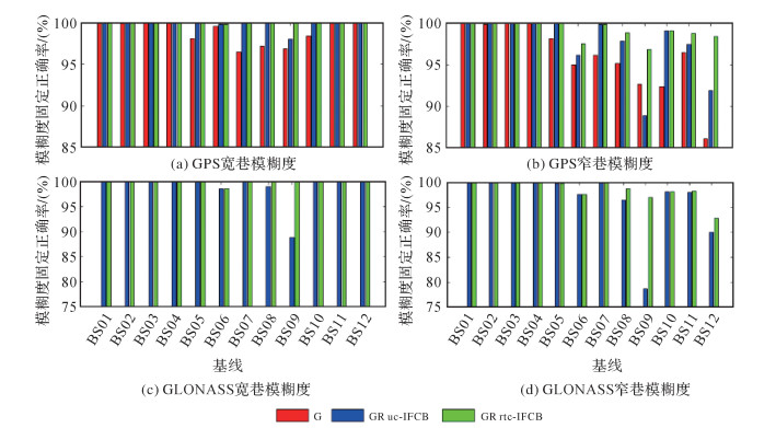 站间IFCB改正能够显著提高中长距离基线的GPS和GLONASS卫星模糊度固定成功率和正确率,如图 10和图 11所示。站间IFCB导致基线BS09的GLONASS卫星窄巷模糊度固定成功率低至52%,改正后提高到约90%,模糊度固定正确率也从85%提高到96%。短基线(BS01-BS04),双差大气延迟量级较小,可忽略,模糊度固定容易,改正站间IFCB对模糊度固定的影响不大。但是,当站间IFCB量级很大时,改正站间IFCB对提高模糊度固定效率十分必要。