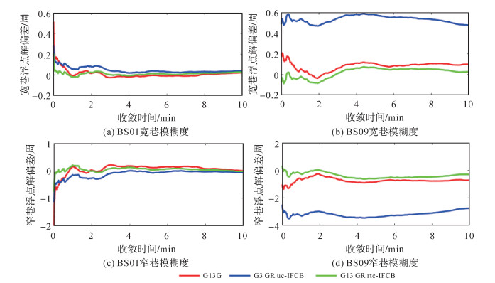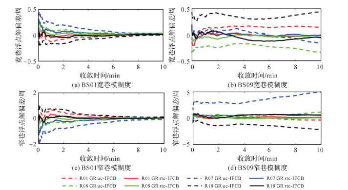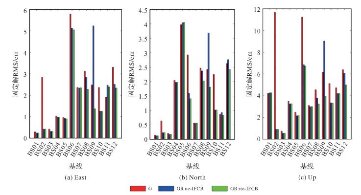 为验证实时站间IFCB算法可行性,本文采用单GPS、未改正站间IFCB的GPS/GLONASS组合,以及实时改正站间IFCB的GPS/GLONASS组合3种RTK定位模式,分别以G、GRuc-IFCB和GR rtc-IFCB表示。RTK定位解算每小时初始化一次,统计其收敛时间、首次固定时间、模糊度固定率和定位偏差等指标。