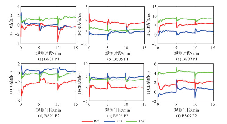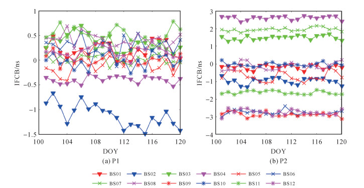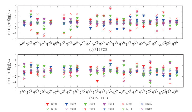 图 4中给出了所有基线各颗GLONASS卫星的站间IFCB单天解估值均值。图 4中信息能够证明基于图 2和图 3获取的结论具有普适性。以卫星R14为例,基线BS09 P1站间IFCB的量级接近6 ns;基线BS09和BS05的P1站间IFCB之差约10 ns。基线BS01 R12卫星P1站间IFCB小于-0.3 ns,而其P2站间IFCB接近-4 ns。同质基线所有卫星的站间IFCB估值分布在[-0.6, 0.6] ns区间内。