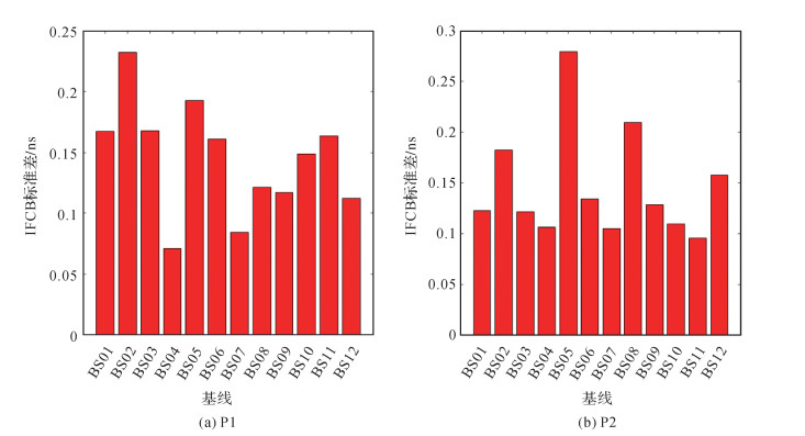 2.2 站间IFCB估计结果和特性分析图 2给出了GLONASSR01卫星两个频段伪距(P1和P2)的站间IFCB单天解时间序列。各条基线站间IFCB存在明显差异,一些基线的站间IFCB接近3 ns,如基线BS06、BS09、BS12的P2站间IFCB。同一条基线P1和P2站间IFCB的量级存在很大差异,如基线BS04 P1站间IFCB约-0.4 ns,而P2站间IFCB达到2.6 ns。同质基线BS10的站间IFCB估值明显比异质基线小,其P1和P2上站间IFCB估值均小于0.3 ns。站间IFCB单天解估值具有一定的稳定性,如图 3所示,所有基线的GLONASSR01卫星单天解的标准差均小于0.3 ns。受多路径等未模型化误差的影响,基线BS02 P1和基线BS05 P2的站间IFCB标准差较大,分别约0.24 ns和0.28 ns。