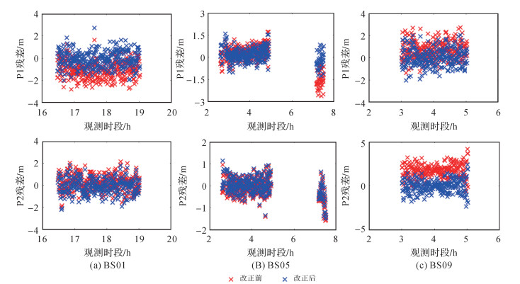图 5给出了R09卫星改正站间IFCB前后的伪距观测值残差。由图 5可知,BS01 P1、BS05 P1、BS09 P1、BS09 P2都存在明显的系统性偏差。例如,BS09 P2的残差分布在区间[0, 5] m之间,均值在2.3 m左右。由于参考卫星的变换,BS05 P1残差在两个观测时段的系统偏差项不同。改正站间IFCB以后,所有卫星的伪距残差分布区间明显向0平移,BS05伪距残差在两个观测时段的分布区间差异也被消除。