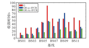 图 9统计了所有基线不同模型RTK解算模式下的收敛时间。本文将RTK定位水平方向偏差稳定在小于0.1 m作为判定收敛完成的阈值[14, 27]。基线BS04、BS08和BS09受站间IFCB的影响,GPS/GLONASS组合RTK定位收敛速度较单GPS RTK定位变慢。站间IFCB实时改正后,GPS/GLONASS组合RTK收敛速度明显加快,大部分基线的收敛时间减小到单GPS RTK的60%以下,解决了因引入GLONASS卫星导致异质基线收敛速度降低的问题。站间IFCB改正算法对同质基线BS10 GPS/GLONASS组合RTK定位收敛时间的影响很小。基线BS06因流动站数据质量较差,定位收敛速度较慢,单GPS RTK需要约90 s完成收敛。
