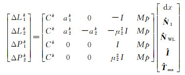 式中,k为历元编号;[ΔL1k ΔL2k ΔP1k ΔP2k]T为当前历元的双频观测值残差向量;C为卫星到流动站的方向余弦向量;a1k和a2k为对角矩阵diag(λ11 λ12 … λ1α)和diag(λ21 λ22 … λ2α),α为可见卫星数;I为α×α单位矩阵,Mp为卫星的天顶对流层湿延迟映射函数向量;dx、