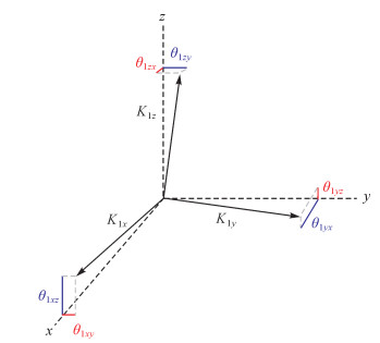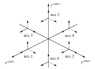 | 图 1 梯度仪坐标系中3对加速度计安置结构 Fig. 1 Arrangement of the three pairs of accelerometers in the GRF |
