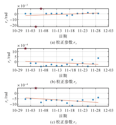 在第1类ESA模型基础上,本文增加了SSRF与GRF之间旋转矩阵随时间变化的参数ΔR,这一变化将对角速度及姿态重建过程产生影响,引力梯度分量也将产生相应改变。这里给出新增参数ΔR的数据序列及线性拟合序列,图 10中存在几个明显异常值,分析相应时间段内3个恒星敏感器工作状态,统计发现在异常值存在的时段内,仅有单个恒星敏感器数据可用的时刻数远大于其他时段相应值,这也体现了联合多个恒星敏感器的优势和必要性。rx、ry、rz数值绝对值在100″左右且该月数值呈现约3~30″的线性趋势,因而建立校准模型时该校准参数不应被忽略。