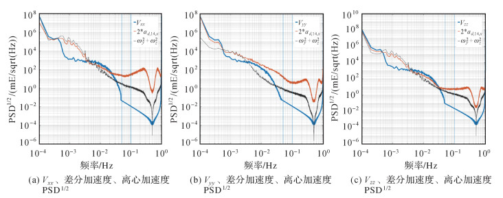 | 图 3 0.05~0.1 Hz内离心加速度、差分加速度、引力梯度PSD1/2比较 Fig. 3 Comparison of PSD1/2 of centrifugal acceleration, differential acceleration and gravity gradients in the 0.05~0.1 Hz |