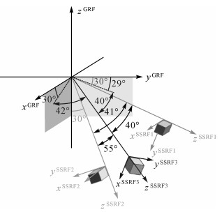 1.2 恒星敏感器的联合GOCE卫星上搭载的3个恒星敏感器STR1、STR2及STR3,提供了卫星的姿态信息。敏感器的一个特性是绕视轴即z轴方向的角速度ωzSSRF精度低于绕x、y轴角速度ωxSSRF、ωySSRF的精度,坐标转换过程中ωzSSRF的误差将传播至ωxGRF、ωyGRF与ωzGRF中。根据星敏感器与梯度仪的相对关系(图 4),本文利用最小二乘平差将有效星敏感器的姿态四元数联合[6, 10],确保后续校准结果更可靠,且角速度精度更高。