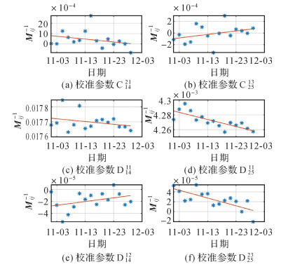 图 6给出了部分Mij-1序列,C1421表示式(12)中14加速度计对C14第2行第1个参数,与理想情况相较(比例因子、偏差因子分别为1、0),结果显示矩阵Cij, Dij(ij=14, 25, 36)非对角线差值数量级为10-5~10-4,对角线差值数量级为9×10-4~2.7×10-2,考虑到一个月内校准参数存在最大约2×10-5的线性趋势,将参数线性拟合后再进行校准,表 1是拟合得到的一组比例因子的数值。图 7为本文第1类方法校准后引力梯度张量迹的功率谱密度与ESA的校准结果,吻合良好。图 8为恒星敏感器联合前后引力梯度张量迹的PSD1/2。