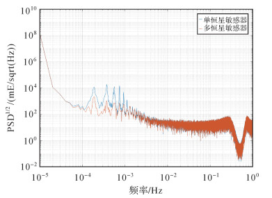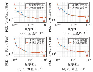 图 8与图 9给出恒星敏感器联合前后引力梯度张量迹的平方根功率谱密度及各分量与参考分量差值平方根功率谱,表明联合多个恒星敏感器可提升低于0.005 Hz频段内引力梯度的精度,梯度张量迹的平方根功率谱最大改进值1.8×105 mE/