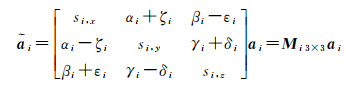 卫星实际运行过程中,通常考虑以下误差因素:①加速度计质心偏离标称位置;②加速度计各坐标轴未严格与梯度仪相应坐标轴对齐;③加速度计3轴不完全正交;④由于数据输出增益的不确定性,产生的加速度计比例因子[10]。将误差参数化为比例因子、偏差因子及二次项,其中二次项以物理振动的方式予以消除[19],因此内部校准矩阵应包括比例因子与偏差因子。图 3表示除非线性二次项以外的加速度计误差因素,每个加速度计包括6个角度校准参数、3个比例因子,6个加速度计共需要确定54个校准参数,定义校准矩阵[6]