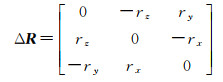 建立以上模型时,做了以下假定:①ESA给定的引力梯度仪基线长Lx、Ly、Lz是准确且为固定常数;②ESA给定的SSRF与GRF间的相对关系是准确且为常数矩阵;本文探索考虑这两个假定是否准确以及其对引力梯度精度的影响,在基础模型上加上新的参数重新建立模型。用微小旋转角rx、ry、rz描述恒星敏感器与梯度仪坐标系间旋转矩阵随时间的变化对角加速度的综合影响,用GRF′表示标称梯度仪坐标系,GRF表示存在偏差的坐标系,两坐标系中角加速度的关系表达为
