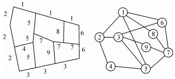 1.1 道路选取案例描述道路选取案例主要由案例对象和特征项组成,以道路stroke作为案例对象,基于stroke构建道路对偶图,进而计算特征项。其中stroke指自然延伸未断裂的道路[22],通常基于几何与专题规则进行构建,前者指两条路段转折角小于阈值60°[23],后者指两条路段具有相同的等级和名称。道路对偶图通过将stroke表示为节点(V={v1, v2, …, vn}),将节点间关系表示为边(E={vivj|vi, vj∈V}),进而深入分析路网结构[24],具体如图 1所示。