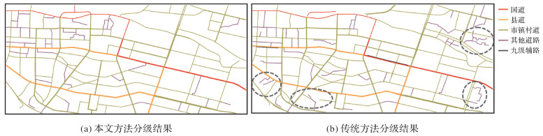 本文方法选取结果与1∶5万比例尺基础案例数据的同名实体匹配个数为135,而传统stroke选取方法的同名实体匹配个数为119,说明本文方法选取结果与基础案例更相似,更能反映专家知识。对不同方法选取结果进行分级显示如图 10所示,各等级stroke选取情况见表 5。通过对比发现:①本文方法选取的国道、县道等高等级道路较多,而传统方法选取的市镇村道和九级辅路等中低等级stroke较多。②两种方法保留的其他道路stroke个数相同,但本文方法选取的该等级道路大部分均能形成完整网眼,而传统方法选取的多为悬挂道路(图 10(b)虚线标出)。③本文方法选取的完整网眼数为225,悬挂道路为5条,选取结果道路的总连通度为488;而传统方法选取结果的完整网眼数为209,网眼内悬挂路段较多(18条),同时道路的总连通度仅为474。因此在将导航数据综合为基本比例尺数据过程中,本文方法选取的完整网眼数更多,产生的悬挂道路更少,道路stroke连通性更好,更能保持道路的整体结构和局部关键结构。