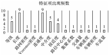特征项方面,选择等级(grade, G)作为语义特征项,选择长度(length, L)、连通度(degree, D)、接近度(closeness, C)、中介度(betweenness, B)作为数值特征项,综合评价stroke的重要性。其中等级反映道路的属性信息,长度反映道路的几何信息,连通度、接近度、中介度反映道路的拓扑信息,可以保证重要道路优先选取等基本原则[2]。同时,通过对10篇以stroke为对象的道路选取文献进行统计分析(图 2)[4, 9-11, 22-27],表明本文的特征项选择合理,各特征项的计算方法及具体含义见表 1。