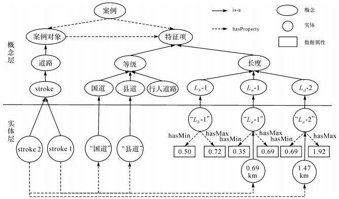 道路选取本体模型包括概念层和实体层,其中概念层涉及案例对象、特征项等概念,实体层表示概念的具体实例。本文以等级语义特征项和长度数值特征项为例,具体说明本体构建过程,其他特征项与此类似。首先,根据基础案例数据的语义特征项,构建国道、县道等概念。其次,分析基础案例数据的长度数值分布情况,利用二分k-means算法[29]对数值进行聚类,提取均匀分布且可表示数值区间的实体,利用“hasMax”与“hasMin”数据属性描述取值范围,同时为统一表示方式,定义实体的区间为左开右闭,如实体“La-1”的取值区间(0.35, 0.69],实体“Lb-1”的取值区间(0.69, 1.92]。然后增加“is-a”父子关系和“hasProperty”属性关系,其中父子关系描述概念的上下位关系及实体与概念的所属关系[30],属性关系描述案例、案例对象与特征项间关系。如图 4所示,案例对象stroke 1表示长度为0.69 km的国道,案例对象stroke 2表示长度为1.47 km的县道。最后基于导航、OSM等多源试验数据增加其他相关概念和实体,如概念行人道路和实体“Lb-1”,其中“Lb-1”的取值区间为(0.50, 0.72],可完善道路选取本体,为多源数据的相似性度量提供知识共享基础。