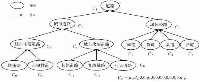 式中,da指概念Ca父概念的所有子概念数量,即局部密度,关联概念指与概念Ca直接或间接关联的所有父概念和子概念。如图 5所示,父概念城市次要道路具有3个子概念:其他道路、九级辅路和行人道路,因此每个子概念的局部密度均为3。概念行人道路的关联概念包括道路、城市道路、城市次要道路和行人道路,局部密度分别为1、2、2和3,因此概念向量C14=(1, 2, 0, 0, 2, 0, 0, 0, 0, 0, 0, 0, 0, 3)。基础案例的道路等级包括国道、县道、城市主要道路、城市次要道路,导航数据包括国道、县道、市镇村道、其他道路、九级辅路、行人道路,概念相似性度量结果见表 2,由此可建立跨数据源的等级概念语义关联。其中导航数据的国道、县道分别与基础案例的国道、县道为相同概念,市镇村道与城市主要道路属于相似概念,其他道路、九级辅路、行人道路与城市次要道路为相似概念。
