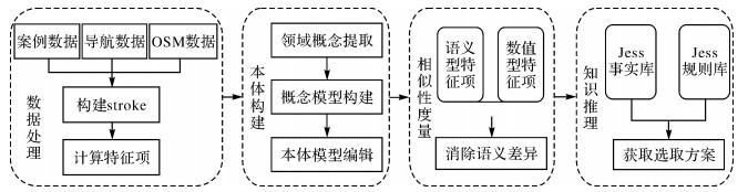 道路选取指通过评价道路重要性,保留主要道路、删除次要道路,达到选取目的[4]。早期基于传统模型的评价方法主要包括基于语义等级[5]、网眼密度[6]、stroke[7]及图论[8]等方法,其中基于stroke的选取方法效果较好[9-11],可有效保持道路的几何连续性。随后部分学者借助智能模型,提出了基于遗传算法[12]、决策树[13]和神经网络[14]的选取方法,在一定程度上提高了道路选取的自动化水平,但制图综合问题并非都能模型化,建立其知识法则成为必然[1]。近年来,国内学者将案例推理方法(case-based reasoning, CBR)应用于道路选取[15],以实现智能化制图综合。该方法可简化知识获取过程,降低知识表示难度,但传统案例的适用性较差,难以实现面向其他数据源的知识推理。为实现知识表示与共享,部分学者利用本体表达领域知识[16],并结合相似性度量方法解决多源数据的语义不一致问题[17-19],同时文献[20—21]利用本体描述专家案例,提高了系统的决策能力。虽然本体的知识表达能力较强,但知识推理能力不足,难以实现跨数据源道路选取的过程性知识推理,智能化程度有待提高。