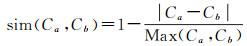 除语义特征外,道路选取本体模型还涉及众多数值特征项概念,根据数值类型可分为离散特征项和连续特征项,其中离散特征项指取值为整数的连通度,连续特征项指取值被聚类为若干连续区间的特征项,具体包括长度、接近度、中介度。离散特征项方面,由于连通度取值通常为整数,且整数间距离越大则表示的语义差异越大[17],因此本文利用连通度值的相对距离评价其相似性,计算公式为