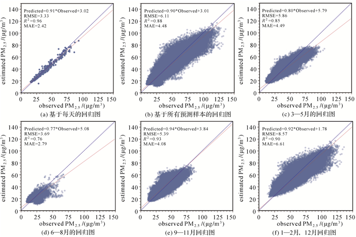| 图 10 PM2.5浓度预测值和观测值的回归图 Fig. 10 Correlation between the observed and estimated PM2.5 concentrations |
