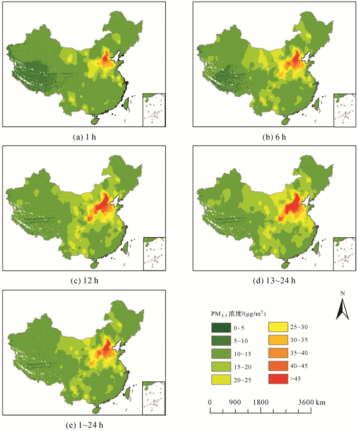 利用2016—2019年每个PM2.5监测站实时的数据,采用十折交叉验证的方式评估模型的性能。表 4为改进的S-BPNN空间化模型和S-BPNN模型十折交叉验证结果。由表 4可知,S-BPNN模型训练数据集和测试数据集的平均R2分别为0.77和0.75,而改进的S-BPNN模型R2分别为0.88和0.87,RMSE和MAE值都小于S- BPNN模型的值,RMSE和MAE的值分别提高了24.31%和25.33%,而且对比改进的S-BPNN模型和S-BPNN模型误差的标准差,可以发现改进的S-BPNN模型各项误差的波动较小,表明了改进的S-BPNN模型通过改变模型的网络结构,将空间滞后变量作为主要输入,其他特征数据作为辅助输入,可以实现更高的精度和稳定性,且适当增加隐藏层的层数可以提高模型的预测性能。本文基于预报模型预测的2020年7月29日未来24 h的PM2.5浓度,结合改进的S-BPNN空间化模型绘制了中国在空间分辨率为10 km时未来1~12 h、13~24 h和1~24 h PM2.5浓度的平均分布图,图 11展示了基于改进的S-BPNN模型全国大范围PM2.5预测值的空间分布(未来1 h、6 h、12 h、13~24 h平均和1~24 h平均)。如图 11所示,从季节上看,全国在夏季的PM2.5浓度值普遍偏低,全国大范围地区的PM2.5浓度值都低于30 μg/m3。从时间上看,PM2.5浓度值具有显著的时间相关性,相隔时间越短,其PM2.5浓度变化较小。从空间上看,我国PM2.5浓度值偏高地区主要集中于华北地区,这与该地区的产业发展,地理位置与气候条件等密切相关。