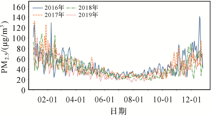 | 图 2 1月1日—12月31日全国日均PM2.5浓度值(2016—2019年) Fig. 2 Daily average PM2.5 concentration values in China from January 1 to December 31 (2016—2019) |