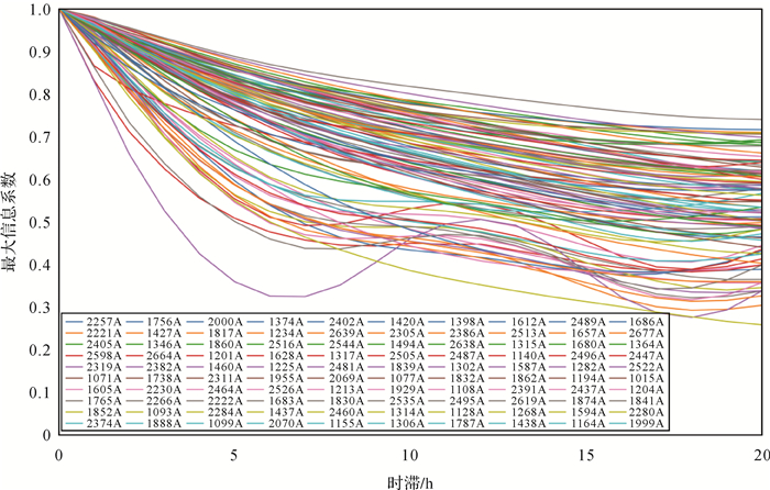 图 4显示了全国范围为内随机选取的100个空气质量监测站0~20 h时间间隔的最大信息相关系数变化情况。由图 4可知,相关系数随时滞的增大而减小,时滞越小,相关程度越强,这说明了PM2.5数据具有显著的时间相关性,这些发现同样可为预测任务选择合适的时滞。
