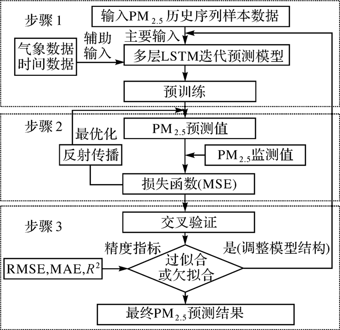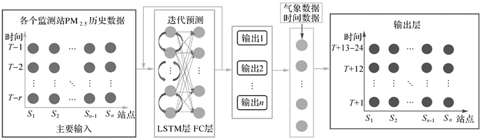 (1) 由于考虑PM2.5监测站点间显著的时空相关性,以每个区域各个PM2.5监测站点的历史序列数据作为模型的主要输入,以气象数据和时间数据作为辅助输入,通过多层LSTM迭代预测模型进行训练,得到未来24 h PM2.5浓度的预测值。