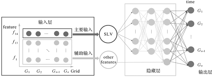 该模型网络结构主要由输入层、隐藏层和输出层组成,其中输入层是由每个网格点的所有特征组成的,包括主要输入和辅助输入。首先,将全国划分将近为10万个10 km×10 km的网格点。由PM2.5浓度时空分析可知,PM2.5浓度具有高度的空间相关性,对于每个网格单元的PM2.5浓度与其空间距离最近的m个网格单元的PM2.5浓度具有显著的相关性,所以将各个网格点的空间滞后变量(SLV)特征作为主要输入,计算公式见式(5)