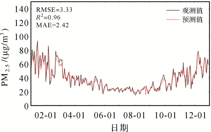 为了验证预测模型的性能以及捕捉时间序列的能力,图 9展示了全国地区2019年1月1日—12月31日的日均PM2.5观测值和多层LSTM迭代模型预测的PM2.5浓度的变化曲线。由图 9可知,PM2.5预测值与观测值的时间变化趋势之间存在一致性,表明多层LSTM迭代模型能很好地预测未来PM2.5浓度的时间序列变化。