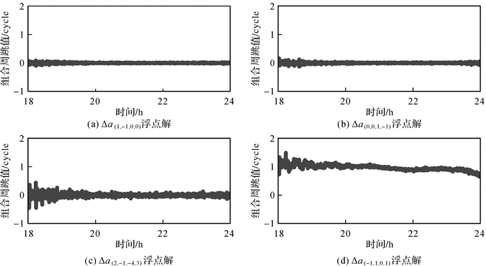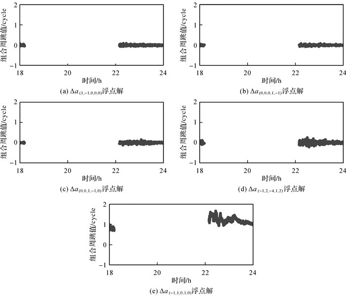 1.2 伪距-相位GF模型的超宽巷周跳探测式(11)包含了两个相位组合周跳,显然需事先确定其中一个组合周跳,才有可能确定另外一个组合周跳。而式(10)中只包含了一个相位组合周跳,但受到历元间电离层变化量和伪距组合噪声的影响。考虑到f个频率信号可构造f-1个独立的超宽巷(extra-wide-lane, EWL)或宽巷(wide-lane, WL)观测值[22],超宽巷的波长可达到数米,以至于式(10)中的历元间电离层变化量和伪距噪声对周跳的整数影响较小,从而正确固定周跳,即伪距-相位GF模型计算的周跳浮点解及精度为