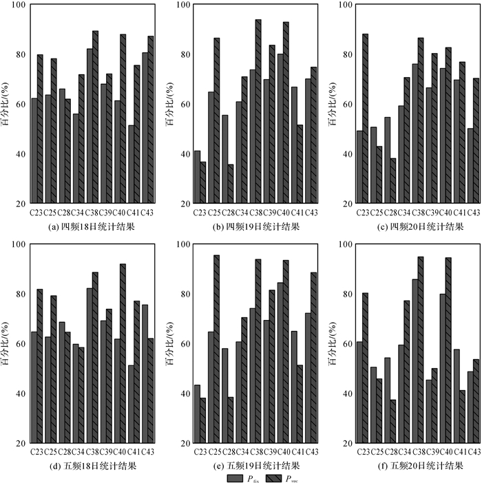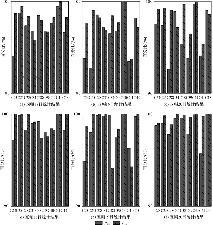 分别计算3 d四频数据和五频数据的周跳探测结果,其统计结果如图 4所示。所有卫星的固定率大于93%以上,且固定成功率大于94%,所有卫星的固定率均值和固定成功率均值都大于96%。此外,对比四频和五频信号,五频的固定率和固定成功率都比四频有所提升。在有些历元,五频能固定四频因舍入误差而无法固定的周跳。表 4给出了测试时间段内每颗卫星五频固定成功而四频失败的总次数。