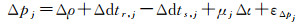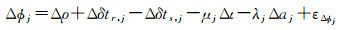 式中,下标j、r和s分别表示第j个频率、测站和卫星;Δρ为包含卫地距和对流层信息的几何距离变化量;Δι和μj=f12/fj2分别为历元间电离层延迟及其系数;Δδtr和Δdtr分别为相位和伪距的接收机钟差的历元差;Δδts和Δdts表示相位和伪距的卫星钟差历元差;Δaj为潜在的周跳;εΔϕj和εΔpj表示相位和伪距对应的随机噪声。