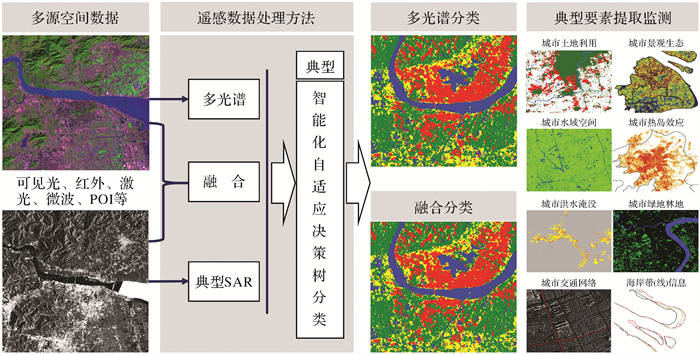 | 图 1 融合多源数据的城市典型要素智能分类与识别监测 Fig. 1 Intelligent classification, recognition and monitoring of typical urban elements using multi-source spatial data |