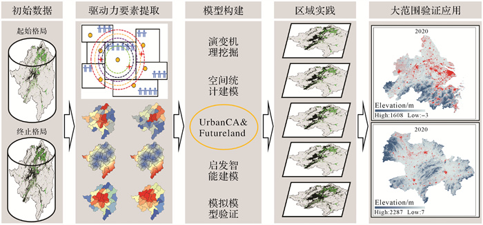 | 图 2 城市空间演变模拟推演的技术框架与关键应用 Fig. 2 Technical framework of urban evolution simulation models and their applications |