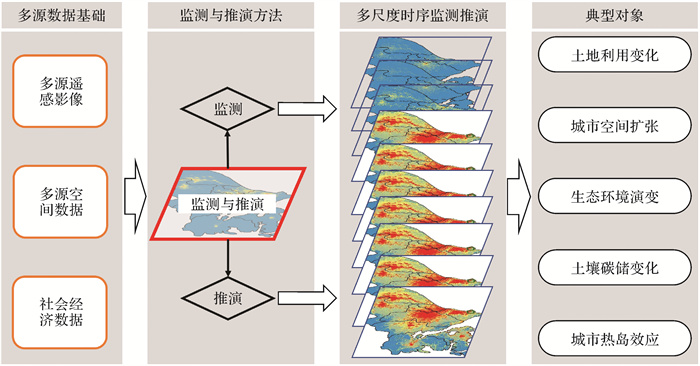 3 典型监测与推演对象在多源空间和非空间数据的基础上,基于智能监测与模拟推演计算,针对土地利用变化、城市空间扩张、生态环境演变、土壤碳储变化、城市热岛效应等的遥感监测与模拟推演,构建了城市典型要素和对象的遥感监测与模拟推演框架(图 3)。