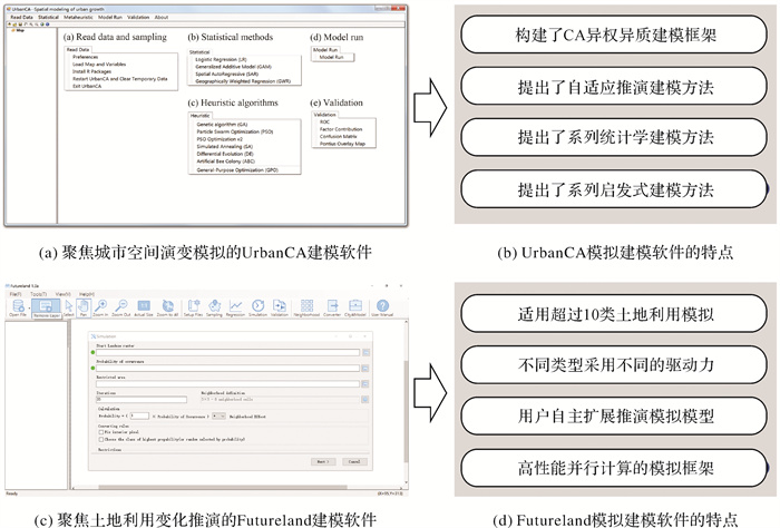 | 图 4 面向城市和土地利用的UrbanCA和Futureland模拟推演系统平台 Fig. 4 Typical software platforms for urban spatial evolution and land use modeling |