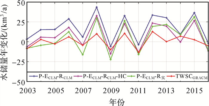 水平衡法中P-ECLM-R实和P-ECLM-RCLM与GRACE模型估算的陆地水储量月变化之差值计算的均方根误差分别为3.41 km3/month和3.61 km3/month;年变化差值计算的均方根误差分别为13.1 km3/a和19.74 km3/a。由图 4和表 2可知,P-ECLM-R实比P-ECLM-RCLM更接近GRACE模型的估算结果,其原因为GLDAS中的CLM模型未模拟人类活动耗水(human consume, HC)(包括工业、生活、农业灌溉和生态耗水)和水库储水(reservoir storage, RESS)等因素对区域陆地水储量变化的贡献[36];人类活动耗水量将转为径流和蒸散量输出,水库的径流拦截及水面蒸发作用也会影响水量平衡方程的闭合性,而实测径流考虑了人类活动的影响。此外,表 2中GRACE模型及水文模式计算的陆地水储量变化长期趋势均不显著,部分月份数据质量较差,导致其不确定度较大。