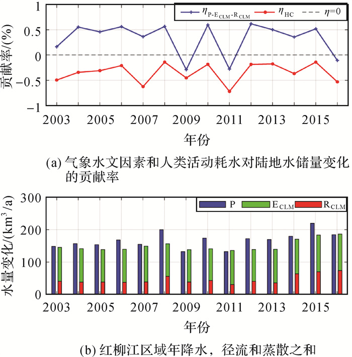 探明区域陆地水储量变化的驱动因素有助于认识区域水循环发生机制,为区域防灾减灾提供技术保障[7-9]。文献[10-11]通过分析气象水文因素对全球168个流域陆地水储量变化的影响,发现在低纬度流域降水对水储量变化的贡献较大,而在中高纬度流域蒸散和径流的贡献更大。文献[12]利用GRACE和水文模拟定性分析了2002-2010年气象水文因素与人类活动对全球30个流域水储量变化的影响。此外,还有学者重点探究了水库蓄水对流域水储量季节性变化的影响[13-15]。然而,定量评估不同驱动因素对陆地水储量变化贡献的相关研究较少,且主要量化降水、径流和蒸散单个气象水文因素的贡献[10-11, 16]。本文综合量化分析气象水文因素、人类活动耗水及水库水储量变化对红柳江区域陆地水储量变化的影响。