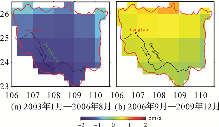 龙滩水库(面积约为63.18 km2)于2006年9月开始蓄水,到2009年底蓄水完成,水位上涨了330 m。图 7(a)、(b)分别为龙滩水库蓄水前(2003年1月-2006年8月)和蓄水阶段(2006年9月-2009年12月)红柳江区域陆地水储量异常趋势空间分布,箭头方向表示红水河流向,其平均水储量变化速度分别为-1.28 km3/a和0.15 km3/a。该区域陆地水储量在龙滩水库蓄水阶段整体呈现增长趋势,且红水河上游区域水储量增长速度高于中下游区域,表明水库蓄水促进了区域陆地水储量的增长。