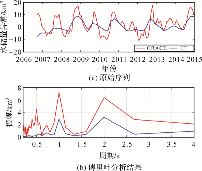 | 图 8 GRACE和龙滩水库(LT)实测水储量异常原始序列和傅里叶分析结果 Fig. 8 Original and Fourier analysis result of GRACE and in-site Longtan Reservoir water storage anomaly |